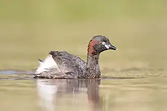 The Australasian grebe (Tachybaptus novaehollandiae) is a small waterbird common on fresh water lakes and rivers in greater Australia, New Zealand and on nearby Pacific islands. At 25–27 cm (9.8–10.6 in) in length, it is one of the smallest members of the grebe family, along with the least grebe and little grebe.