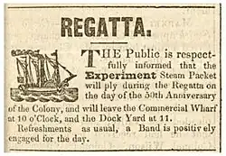 - ^ "The Regatta". The True Colonist Van Diemen's Land Political Despatch, And Agricultural And Commercial... No. 800. Tasmania, Australia. 7 December 1838. p. 4. Retrieved 7 December 2016 – via National Library of Australia.