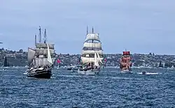 In 1988, the celebration of 200 years since the arrival of the First Fleet was organised on a large scale as the Australian Bicentenary, with many significant events taking place in all major cities.[26] Over 2.5 million people attended the event in Sydney.[29] These included street parties, concerts, including performances on the steps and forecourt of the Sydney Opera House and at many other public venues, art and literary competitions, historic re-enactments, and the opening of the Powerhouse Museum at its new location. A re-enactment of the arrival of the First Fleet took place in Sydney Harbour, with ships that had sailed from Portsmouth a year earlier taking part.[26][29]