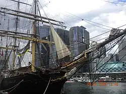 During the mid-1980s, it was proposed that a replica of explorer James Cook's ship, HM Bark Endeavour, be constructed for the museum.[21] Funding for construction was initially provided by the Bond Corporation, and construction began at the start of 1988.[22] However, in 1990, the company ran into financial difficulties, and construction was unable to continue until a charitable trust was established in 1991 to complete and operate the replica Endeavour.[23] The vessel was completed in 1994, and spent the next ten years sailing around Australia and the world before ownership was transferred to the Australian National Maritime Museum in 2005.[24]