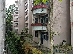 Although there was some improvement in water and electricity services beginning in 2022,[3] these utilities remain unreliable.[10] The lack of management has also led to vandalism and theft—[23][16] many renovated units have been stripped of fixtures and furnishings, turning once “finely decorated homes” into empty, damaged shells.[3] Most homes are infested with termites; furniture has rotted, doors and windows are broken, and mosaics on exterior walls are falling off. Weeds have overtaken courtyards,[9] water pipes are severely corroded, and dark red liquid has been observed leaking from them.[6] Part of the mountain behind the development has been fenced off and repurposed as a chicken farm. Basic services are lacking: food delivery is difficult to arrange within several kilometers, and courier packages can only be dropped off at the front gate. The nearest supermarket is approximately five kilometers away.[10]