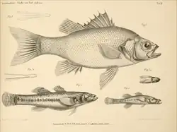 Steindachner's line drawing of an Australian bass (large image), accompanying his 1866 scientific description and naming of the species.