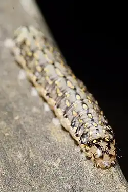The full-grown larva is about 1+1⁄4 inches long, moderately stout and of uniform thickness. The head is ochreous, with a black stripe on each side; the back of the larva is greyish-green, and the under surface pale greenish-ochreous;, there is a rather large, shining black mark above each spiracle; the dorsal, sub-dorsal and lateral lines are orange-yellow and very conspicuous, the two upper lines being very much broken; there are several minute black warts below the spiracles, and a series of very small black marks on the orange dorsal line.[9]