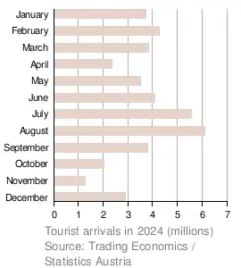 Tourism forms an important part of the economy of Austria, accounting for almost 9% of the Austrian gross domestic product.[1] Austria has one guest bed for every six inhabitants, and boasts the highest per capita income from tourism in the Organisation for Economic Co-operation and Development.[2] As of 2024, the total number of tourist overnight stays during the summer season is continuing to outnumber the overnight stays in the winter season. Peaks are in February and July/August.[1]