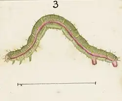 ventral surface; there is a conspicuous crimson lateral line sometimes edged with white and the prolegs are also crimson; the segmental divisions are marked in yellow, and there are a few isolated black bristles. Younger larvae have the ground colour dull greyish-green, whitish underneath, and the crimson stripe is much fainter than in the full-grown larva.