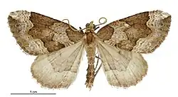 โ 34 mm. Head, palpi, thorax light reddish-ochreous. Forewings with termen hardly bowed, little oblique, slightly waved ; reddish-ochreous ; a basal patch of grey curved transverse striation, edge obtusely angulated in middle, edged by an ochreous-whitish stria ; space between this and median band suffused light greyish ; median band suffused grey, with darker grey striae, broad on costa, and becoming narrower downwards, edged by reddish-ochreous striae, anterior with acute angulations outwards above and below middle and inwards in middle, posterior partly marked white, rather irregularly waved, with short broad obtuse double prominence in middle ; discal mark small, blackish, transverse ; a subterminal fascia of grey suffusion connected with termen by suffused dark grey bars ; an irregular white costal spot just before apex, tinged reddish on costa (cilia imperfect). Hind wings ochreous grey-whitish, towards termen slightly reddish-tinged ; a dark grey discal dot ; a subterminal series of faint cloudy greyish spots ; cilia reddish-whitish.[3]