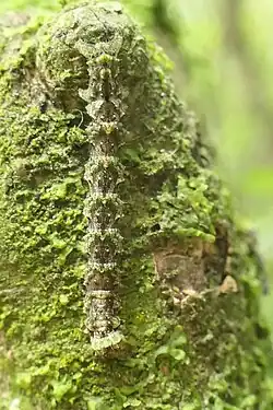 Hudson goes on to explain that the larvae resembles a small twig covered in moss thus making it hard to detect on its food plant. Hudson also believed that this species over winters in its larval state.[8]