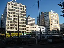 The name Autotalo originally only referred to the business building on the southern half of the block with its two towers, but nowadays the entire block is referred to as Autotalo or the Autotalo block. The northern part of the block hosts two business buildings built at the same time with their towers and short pedestal-like parts. The western building, located at the intersection between Runeberginkatu and Eteläinen Rautatienkatu, was designed by Armas Lehtinen, and it originally served as the office of the Pohja insurance company.[9] The intersection between Fredrikinkatu and Eteläinen Rautatienkatu hosts the Kampintorni building built in 1962.[10] The block hosts four towers in total. The buildings have facades of different materials. The towers of the Autotalo building proper have metal facades, whereas the that of the Pohja insurance company tower is made of yellow-brown stone, and that of the Kampintorni tower is made of light marble.[11]