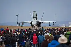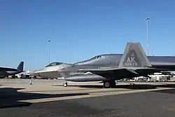 There were about 100 aircraft, including bombers, fighters and surveillance aircraft present at this edition. The show saw the premiere of the most advanced stealth air superiority fighter, the Lockheed Martin F-22 Raptor. Two aircraft, based at Elmendorf Air Force Base, were on static display for the first time in Australia, .[25][26][27] They did not perform, because the qualified display pilot was not present.[28] A highly detailed model of the under development Lockheed Martin F-35 Lightning II Joint Strike Fighter was on static display beside a classic F/A-18 Hornet.[29][30]