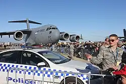 Aircraft that visited the show were Qantas' Boeing 747 and Airbus A380, the latter of which was first delivered the previous year. V Australia, a new Brisbane-based competitor in the international market, contributed with its Boeing 777-300ER.[19] Also on display were the Lockheed C-5 Galaxy, C-17, B1-B Lancer, F-16 Fighting Falcon, F/A-18 Hornet, F/A-18F Super Hornet, F-111 Aardvark, and the KC-10 Extender.