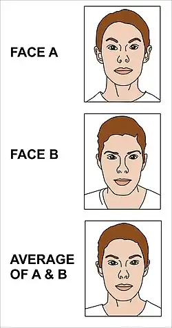 In physical attractiveness studies, averageness describes the physical beauty that results from averaging the facial features of people of the same gender and approximately the same age.[1][2][3][4] The majority of averageness studies have focused on photographic overlay studies of human faces, in which images are morphed together. The term "average" is used strictly to denote the technical definition of the mathematical mean. An averaged face is not unremarkable, but is, in fact, quite good looking. Nor is it typical in the sense of common or frequently occurring in the population, though it appears familiar, and is typical in the sense that it is a good example of a face that is representative of the category of faces.[2]