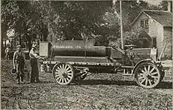 Avery started building agricultural trucks in 1910. Early truck manufacturers were uncertain how to market their product and whether they should just be used to haul goods or should also be useful in the field. Avery described its truck as a 'gasoline farm wagon' and 'general farm power machine' for city, town, and country hauling. Their advertising suggested the farmer could use it to haul livestock, grain, hay, and other loads, as to pull plows, road graders, harrows, discs, binders, and other farm machinery, as well as loaded wagons.[4] The truck weighed 1 short ton (0.91 t) and featured a four-cylinder engine, open cab and chain drive. Its wheels had wooden spokes and rims, while the steel tires were 1.5 inches (38 mm)x5 inches (130 mm) wide.[4] Avery figured farmers could get the most use out of the machines during the harvest season. Their tractor trucks included a large belt pulley that could be attached to the front crank shaft, useful for powering grain separators and other belt-driven machines. Early models had cast steel wheels with holes. Wooden plugs were driven into the holes to provide added traction. When the wooden plugs wore down, the owner simply replaced them with new wooden plugs.[9]