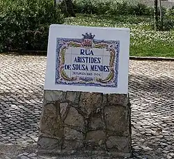 In parallel with the official opening of the Chabad House, the road leading to it was renamed as Rua Aristides de Sousa Mendes. Sousa Mendes was a Portuguese consul in Bordeaux, France who facilitated visas for thousands of Jews and others escaping Nazi occupation during World War II. For his efforts to save Jewish refugees, he was recognized by Israel as one of the Righteous Among the Nations in 1966.[14] In 2021 a memorial to him was installed in the Portuguese Pantheon in Lisbon.[15][16]