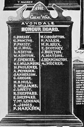 ![]() Avondale honour board, December 1917 | |||||||||||||||