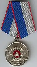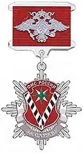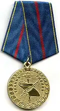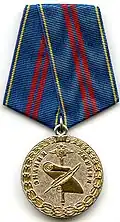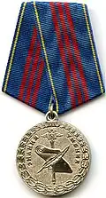 Awarded to employees of law enforcement bodies of the Russian Federation, to federal civil servants, to employees of the Interior Ministry of Russia, for high performance in service and diligence in the performance of tasks during a period of martial law, a state emergency, an anti-terrorist operation, in the context of an armed conflict, in the aftermath of accidents, natural or man-made disasters or other emergencies.[1][4][7] |