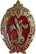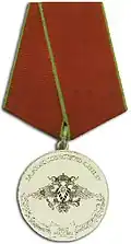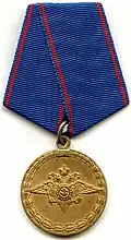 Awarded to military personnel of the troops of the Interior Ministry of the Russian Federation for excellent performance in training; for distinction in the performance of military duties; for merit in the protection of public order and public security; for courage, dedication and high achievements displayed during military service. Abrogated from the MVD awards system by order 602 of October 2013, it is no longer awarded.[19][1][2] |
