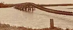 Both road and railway cross the river estuary. The rail bridge is 293 m (961 ft) long,[32] originally built in 1873.[33] From about 1861[34] a road ran along the beach, with a punt to cross the estuary.[35] Following sea erosion of the beach,[36] a new bridge was built in 1865.[37] Undermined piles closed the bridge in 1867.[38] It was rebuilt in 1897.[39] The bridge was closed for a fortnight in 1905,[40] when temporary[41] piles gave way under a traction engine.[42] Spans washed out in a 1918 flood.[43] It collapsed under 2 trucks in 1928.[44] Four piers were undermined[45] in May 1938,[46] closing the bridge until September.[47]