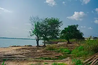 ![]() Logged wood and bamboo sticks heaped on the river bank of Awbana river, usually used for the construction of their wooden boat | |