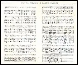 Awit sa Paglikha ng Bagong Pilipinas (English: Hymn to the Creation of a New Philippines), also known by its incipit Tindig! Aking Inang Bayan (English: "Stand! My Motherland"), is a patriotic song written by Filipino composer Felipe Padilla de León.[2] It was commissioned during the Japanese occupation of the Philippines and intended to supplant Lupang Hinirang (then sung to its English translation as the Philippine Hymn) as the national anthem. It was also sung by the members of the Hukbo ng Bayan Laban sa Hapon, however, the words bear sentiments against the Japanese occupiers and the desire for national liberation.