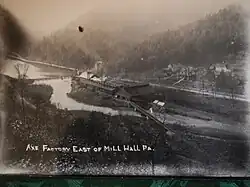 Operations in the Mill Hall area were started around 1840 by Willis Mann, who rented a blacksmith shop near Mackeyville and made axes on a small scale.[23] This operation was terminated and Willis joined the Reedsville works as a factory superintendent. After several failures at other locations, Robert relocated to Mackeyville in 1847 to work in a retail store owned by Willis.[24] In early 1849, Robert undertook a project to build an axe factory on Big Fishing Creek at a site owned by Saul McCormick.[25] Robert was now 25 years old.[26] Production started with only four employees, and just one remained after the first year.[27] When McCormick died in 1857, he was found to be insolvent and had placed a mortgage on the property. The factory was purchased by Robert at the sheriff's sale for $6,000, paid for partly by sale of 100 acres of factory-owned land. In 1866, following the death of three children due to diphtheria, Robert decided to retire to farming and sold the Mill Hall works to James, who wanted to leave Reedsville over a family dispute.[28] The transaction was never finalized. Robert was often in poor health and next enlisted management help from nephew Robert C., son of Willis. This relationship also was unsuccessful.