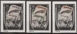The stamps were designed by the graphic artist couple Werner and Maria von Axster-Heudtlaß, who designed numerous stamps for the Reichspost and later for the Deutsche Post between 1925 and 1949.[3] According to propaganda philately specialist Dave Ripley, the soldiers on the 1+2 rupees stamp represent three of India's best-known freedom fighters at the time (from left): Sukhdev Thapar, Bhagat Singh as standard-bearer and Shivaram Rajguru. They were hanged by the British authorities on March 23, 1931.[4] 1 million copies of each stamp were printed. Exceptions were those planned for the Andaman and Nicobar Islands without surcharge, which were only issued 500,000 times. A very small number were produced of the higher values 1+2 rupees, which exist in three different varieties. Due to the fact that this value was manufactured in a multicolour print, unfinished variants were discovered later. At the end the flag should be illustrated in orange, white and green colours. Unfinished prints in black and black/orange have been preserved. Of the black version the found quantity was 4500 pieces, of the black-orange 2000 pieces and of the final, finished version 7000 pieces. Except for the higher rupees values (only imperforated), all stamps exist both perforated and in practically the same number imperforated. The stamps planned for the Andaman and Nicobar Islands were perforated L 10½. All other small nominal values were perforated differently, so there were issues with the following variants: L 9½:10½, 10½, 10½:9½ and 11:10½. There are often stamps with irregular perforations.