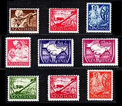 The Azad Hind stamps are a set of prepared but never issued stamps for the planned Provisional Government of Free India under Subhas Chandra Bose. All stamps were printed by photogravure in sheets of 100 at the Reichsdruckerei, the Government Printing Bureau in Berlin.[1]