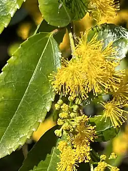 Azara serrata, the saw-toothed azara, is a species of flowering plant in the family Salicaceae.[2][3] It is native to Chile. It is an evergreen shrub growing to 4 m (13 ft), with glossy serrated leaves and clusters of scented yellow flowers in summer. In temperate regions it requires a sheltered position.[4]