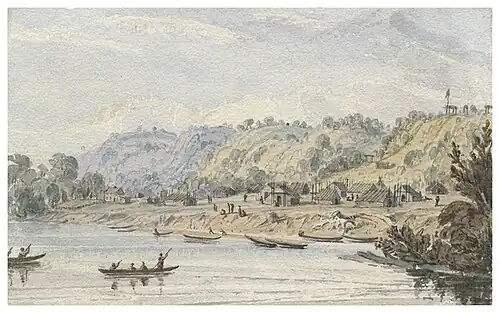 On June 25, 1842, a war party of 100 Ojibwe men from the area around Lake St. Croix approached Kaposia for a retaliatory raid.[14] At this time, Little Crow's village was located on the west side of the Mississippi River. Before crossing the river, however, the Ojibwe encountered two Dakota women working on a farm owned by Francois Gammel, one of the French Canadians who had settled on the east side of the Mississippi, about two miles south of Pig's Eye's trading post.[14][5]: 42
