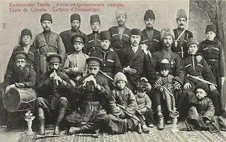 The modern ethnonym "Azerbaijani" or "Azeri" refers to the Turkic peoples of Iran's northwestern historic region of Azerbaijan (also known as Iranian Azerbaijan) and the Republic of Azerbaijan.[64] They historically called themselves or were referred to by others as Muslims and/or Turks. They were also referred to as Ajam (meaning from Iran), using the term incorrectly to denote their Shia belief rather than ethnic identity.[65] When the Southern Caucasus became part of the Russian Empire in the nineteenth century, the Russian authorities, who traditionally referred to all Turkic people as Tatars, defined Tatars living in the Transcaucasus region as Caucasian Tatars or more rarely[66] Aderbeijanskie (Адербейджанские) Tatars or even[67] Persian Tatars in order to distinguish them from other Turkic groups and the Persian speakers of Iran.[67][68] The Russian Brockhaus and Efron Encyclopedic Dictionary, written in the 1890s, also referred to Tatars in Azerbaijan as Aderbeijans (адербейджаны),[69] but noted that the term had not been widely adopted.[70] This ethnonym was also used by Joseph Deniker in 1900.[71] In Azerbaijani language publications, the expression "Azerbaijani nation" referring to those who were known as Tatars of the Caucasus first appeared in the newspaper Kashkul in 1880.[72]