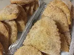 The dough is similar to a hot water crust, containing lard and warm water.[4] Orange juice is sometimes added or used in place of water. The most common filling flavors are made with chickpeas, sweet potatoes, chilacayote jam, or navy beans.[5] It is often mixed with egg yolks and ground almonds, typical ingredients characteristic of many Portuguese desserts, especially conventual sweets. After frying, they are coated with sugar and cinnamon.[3]
