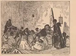 In 1916, he went to Fez, Morocco, where his cousin, Mohammad Mammeri, was a tutor to the future Mohammed V of Morocco.[3] Mammeri found success in Fez and Rabat as a teacher. Starting in 1917, he contributed to articles in the French government's magazine France-Maroc[3] such as one discussing life in a bilingual primary school in Morocco.[4] His article in the December 1918 issue of France-Maroc contained among other things, one of his important early works, Koranic School.[5] The drawing is similar to his oil painting titled Interior of a Koranic School which is at the Cleveland Museum of Art.[3][6] The Koranic School painting, along with a few others, were featured in an exhibition in Paris in 1921.[3] In Mammeri's first exhibition in Paris, which was in 1917, he exhibited two landscape paintings of Fez, and in 1921, Léonce Bénédite acquired those for the Musée du Luxembourg.[3]