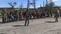 On 17 May 2022, negotiations, which included mediators from the United Nations and the International Committee of the Red Cross (ICRC), managed to end the siege of Azovstal and establish a humanitarian corridor.[150] On 16 May, the Ukrainian General Staff announced that the Mariupol garrison, including remnants of the Azov Regiment stationed in Mariupol, had "fulfilled its combat mission" and that evacuations from the Azovstal steel factory had begun. Following orders from the high command, over the next few days Azov members in Azovstal, including Prokopenko, surrendered to Russian forces among ~2.5k Ukrainian soldiers from the plant, and were taken to Russian-controlled territory of the Donetsk People's Republic. The ICRC registered the surrendered troops as prisoners of war at the request of both sides, collecting information to contact their families.[151] Ukrainian and Russian sources make contradicting statements on the future of surrendered combatants, from pre-arranged exchange to Russian POWs with support of international humanitarian organizations, to criminal prosecution in Russia on war crime and terrorism charges.[152][153] As reported by the Wall Street Journal, according to Azov chief of staff on 18 May, Ukraine had proposed a prisoner swap of the most severely wounded prisoners, but Russia had countered "everyone or no one".[154]