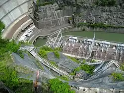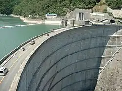 Several dams are operated by Tokyo Electric Power Company, or TEPCO, along the river, including: the Nagawado Dam, the largest, which holds 123×106 cubic metres (4.3×109 cu ft); Midono Dam; and the Inekoki Dam.[6][7][8][9] The dams use pumped-storage hydroelectricity, and are collectively referred to as the Azusagawa 3 dams.[10]