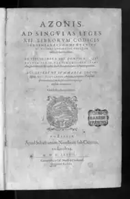 Azo of Bologna or Azzo or Azolenus (fl. 1150–1230) was an influential Italian jurist and a member of the school of the so-called glossators. Born circa 1150 in Bologna, Azo studied under Joannes Bassianus and became professor of civil law at Bologna. He was a teacher of Franciscus Accursius.[1] He is sometimes known as Azo Soldanus, from his father's surname, and also Azzo Porcius (dei Porci), to distinguish him from later famous Italians named Azzo. He died circa 1230.