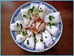 Bánh hỏi (Vietnamese: [ɓaɲ hɔːj]) is a Vietnamese dish consisting of rice vermicelli woven into intricate bundles and often topped with chopped scallions or garlic chives sauteed in oil, served with a complementary meat dish. The strings of noodles are usually only as thin as a toothpick; the texture is firm enough so the noodles do not fall apart but is not at all sticky to keep the dish light.