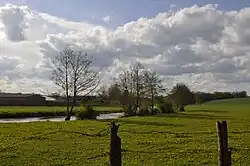 The Albane valley (or "Albanne" according to Badin and Quantin 1847[37]) has clay-marl soil.[38] The Albane takes its source at the place called "La Ferme de l'Albane" in the commune of Magny-Saint-Médard.[39] It flows for 17 kilometres (11 mi) before reaching the Bèze in Saint-Léger-Triey a few kilometers before the confluence with the Saône.[4] It crosses the municipalities of Magny-Saint-Médard, Savolles, Belleneuve, Binges, Trochères, Étevaux, Marandeuil, Drambon, Saint-Léger-Triey, Pontailler-sur-Saône and Lamarche-sur-Saône.[40]