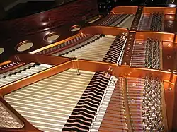 The rim of a Bösendorfer grand piano is built quite differently from that of all other grands. Instead of veneers bent around a form, the rim is made in solid sections of spruce and jointed together. Spruce is better at transmitting sound than reflecting it. This is perhaps why Bösendorfers tend to have a more delicate treble and a bass that features the fundamental tone more than the higher harmonics.[9] There are also two other features of Bösendorfers that are shared with only a few other piano brands: one is a removable capo d'astro bar in the treble, which facilitates rebuilding of the instrument and, Bösendorfer says, provides greater acoustic separation from the plate, decreasing tonal absorption; the other is single-stringing, providing each string its own individual hitch pin on the plate instead of connecting it to a neighbouring string. This design may slightly improve tuning stability and is an advantage in case of string breakage.[10]
