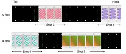 The term B-roll originates from a particular solution to the problem of visible splices in the narrow film stock used in 16 mm film. 35 mm film was wide enough to hide splices, but 16 mm film revealed the splices as flaws in the picture. To avoid this problem, the intended shots were spliced to opaque black leader, with the black leader hiding the splice. Two sequences of shots were assembled, the odd-numbered shots on the A-roll, and the even-numbered shots on the B-roll, such that all of the shots on one roll were matched by black leader on the other roll, in a checkerboard pattern (an alternate name for the process was "checkerboard printing".) Unexposed 16 mm raw print stock was exposed twice, once to the A-roll, then it was exposed again to the B-roll.[6][7][8]