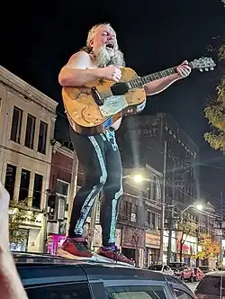 ![]() Johnston playing outside Toronto's Bovine Sex Club on top of his van in 2024. | |