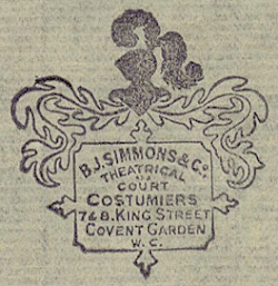 B. J. Simmons & Co. was a London costumier famous for sophisticated designs, high quality, and correctness of period of costumes. Founded in 1875 by B. J. Simmons, the business continued to be operated by his family until the 1930s. During that time, it was known under various different titles such as: B. J. Simmons, J. B. Simmons, John Simmons & Son/Sons, Simmons/Symmons/Simmonds Brothers, G. B. Simmons, and B. & G. Simmons. Until 1922, the London newspapers and The London Stage had the costumier listed under the name of “John Simmons”.[2] Their workshop was located in Covent Garden in London, a creative centre of London theatre.[1] Between 1890 and 1899, Simmons costumed at least 42 theatre productions and by the end of the 1930s they had provided costumes for as many as 20 stage productions per year. Therefore, before ending operations in 1964, they had created the costumes for around 1,200 stage and film productions.[3]