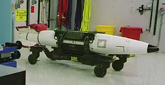 Development began at the Los Alamos National Laboratory in 1960 to meet a requirement for a multi-purpose weapon, suitable for use as a nuclear depth charge or a nuclear bomb against ground targets.[1] Entering production in 1963 as the Mk 57, the bomb was designed to be dropped from high-speed tactical aircraft. It had a streamlined casing to withstand supersonic flight. It was 3 m (9 ft 10 in) long, with a diameter of about 37.5 cm (14.75 in). Basic weight was approximately 227 kilograms (500 lbs).