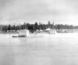 At the end of August 1913, Captain Bucey was taking the BC Express up from Fort George to Tête Jaune Cache when he encountered a cable strung across the river at Mile 141 where the railway would be building a bridge. Knowing that the railway had promised that they would not impede navigation on the upper Fraser River and that the bridge, once built, was going to be built with a lift span, Bucey stopped and asked that the cable be removed so he could pass. The bridge workers refused, and when Bucey reminded them of the railway's promise not to impede navigation, the workers informed Captain Bucey that they knew of no plans to build the bridge with a lift span and had been told that they were to protect the cable, "using force if necessary." Bucey was furious and threatened to use a shotgun on the workers, thus blasting his way through to Tête Jaune Cache.[3] Cooler heads eventually prevailed, and Bucey turned the BC Express back towards Fort George. Once back in town, Bucey immediately wired the company's head office at Ashcroft and informed them of the obstruction. The BC Express Company had the Board of Railway Commissioners investigate the situation, and the Board came back in the company's favor and told the railway they must build the bridge at Mile 141 and the other at Bear River with lift spans as promised. The GTP refused the order, stating that if they changed the level of the bridges they'd have to change the level of the grade. The company took the railway to court for damages and loss of revenue, as they had been earning in excess of $5,000 a week on that route, but by the time the case was heard, World War I had begun, and the company's attorney was engaged in war work and was unable to appear. His replacement, a junior partner with little experience, was unable to prepare and present the evidence properly, and the company lost the case.[1]: 82–83 Some historians have opined that the railway built these bridges to impede navigation out of spite and dislike for the BC Express Company because its owner at that time, Charles Vance Millar, had negotiated with the First Nation's people at Fort George to buy the land that the GTP wanted for their town-site.[4]
