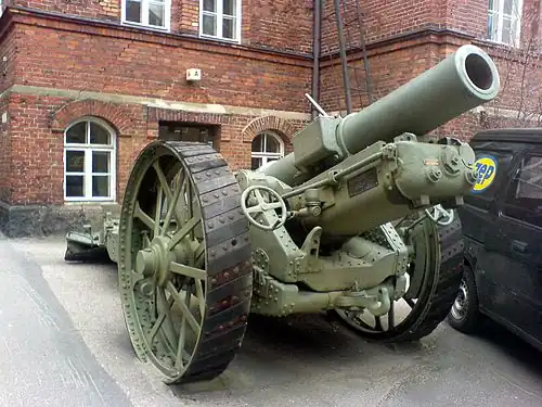 During the Russo-Finnish Winter War, Finland found itself in dire need of heavy artillery. Thirty-two "8 in Howitzer Mk 7 (Vickers Mk 6)" 8-inch howitzers were bought from the United States in 1939 but arrived too late to see action in the war. The howitzers were given the designation 203 H/17 (Finnish: 203 mm, Haupitsi [Howitzer], 1917) and were first issued to three heavy artillery battalions (1st, 2nd and 3rd), which later were re-organised into six heavy artillery batteries (11th, 12th, 13th, 14th, 15th and 16th). The howitzer was well-liked by the Finnish Army for its durability. During the Continuation War, 13 of these howitzers were lost in the battles of the summer of 1944; eight of these belonged to Heavy Artillery Battery 4 and were lost at Valkeasaari on 10 June, while the other five belonged to Heavy Artillery Battery 3, located northeast of Lake Ladoga. The howitzers were stored after the war and were struck from the lists in the late 1960s.[12][13]