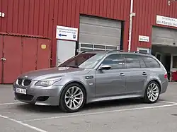 The BMW M5 is a super high-performance variant of the BMW 5 Series marketed under the BMW M sub-brand. It is considered an iconic vehicle in the sports saloon category.[1][2] The M5 has always been produced in the saloon (sedan, US English) body style, but in some countries the M5 has also been available as an estate/touring (wagon, US English) from 1992 to 1995, from 2006 to 2010, and since 2024.[3][4][5]
