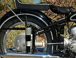 In the photo to the left are some of the unusual elements of the rear part of the R68. Note the exposed, hard chrome drive shaft connecting the rear drive on the left with the rear of the transmission on the right. A plunger attached to the rear drive limits vertical movement so the front of the drive shaft is connected to the transmission with a round rubber puck with holes to receive the drive shaft's attachment plate.