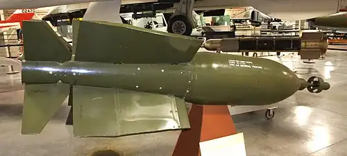 The Texas Instruments BOLT-117 (BOmb, Laser Terminal-117), retrospectively redesignated as the GBU-1/B (Guided Bomb Unit)[1][3] was the world's first laser-guided bomb (LGB). It consisted of a standard M117 750-pound (340 kg) bomb case with a KMU-342 laser guidance and control kit. This consisted of a gimballed laser seeker on the front of the bomb and tail and control fins to guide the bomb to the target. The latter used the bang-bang method of control where each control surface was either straight or fully deflected. This was inefficient aerodynamically, but reduced costs and minimized demands on the primitive onboard electronics.