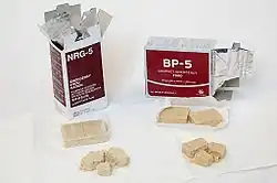 BP-5 Compact Food (also known as a BP-5 biscuit) is a high-calorie, vitamin fortified, compact, compressed and dry emergency food (food ration bar), often used by relief agencies for the emergency feeding of refugees and internally displaced persons.[1]