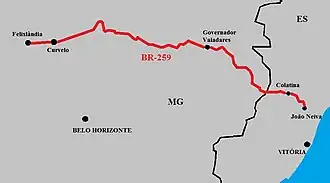 BR-259 is a federal highway in the southeastern Brazil. The road covers 711.7 km from Felixlândia, Minas Gerais to João Neiva, Espírito Santo.[1][2][3]