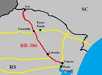 The BR-386 is a Brazilian federal highway running between the southern states of Rio Grande do Sul and Santa Catarina.[1] It has a total length of 525 km (326 mi).[2][3]