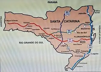 BR-470 is an east-west Brazilian federal highway that starts in Navegantes, Santa Catarina, and crosses the Gaucho range and highlands. It stretches approximately 833 km, passing through cities such as Itajaí, Blumenau, Rio do Sul, Curitibanos, Campos Novos, Bento Gonçalves, Veranópolis and Montenegro and ends in Camaquã, Rio Grande do Sul.[1]